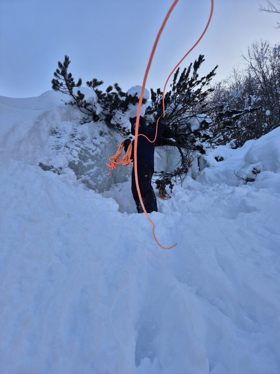 Zbog takvih uvjeta nije bilo moguće provesti planirane vježbe kretanja u derezama i sa cepinom te zaustavljanje pada cepinom. Ipak, pronađeno je prikladno mjesto na kojem se na pregledan način mogla objasniti izrada sidrišta u snijegu i ledu. Sudionici su se tako upoznali s osnovnim pravilima izrade sidrišta općenito, s posebnim naglaskom na zimske uvjete. Nakon pokazne vježbe izrade sidrišta grupa se vratila u Koču na Gozdu gdje je uslijedio odmor i okrjepa.